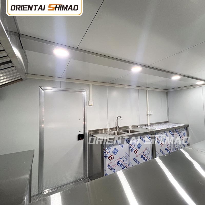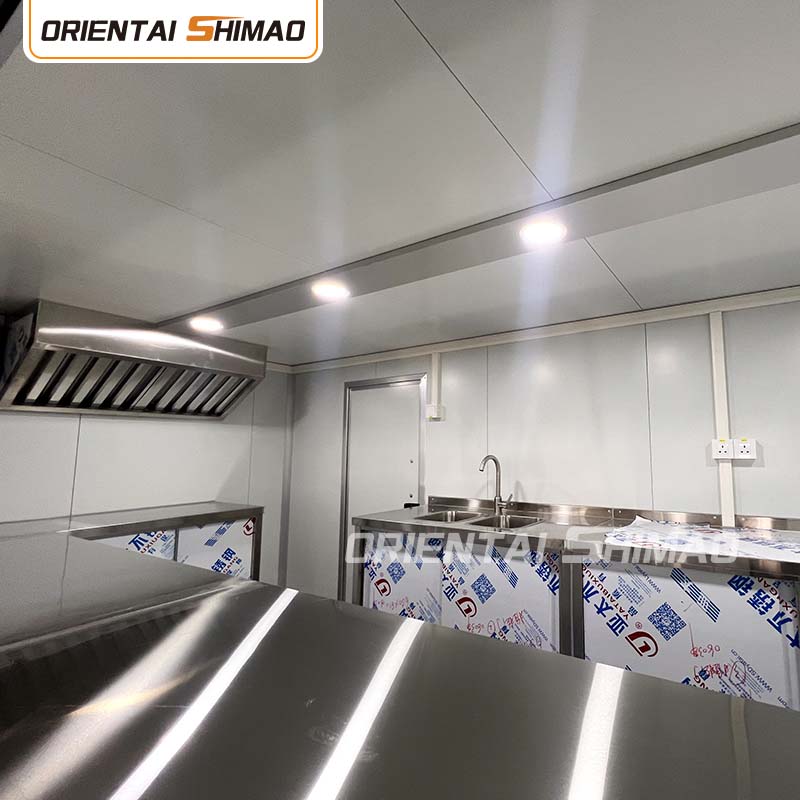 Disposição Interior: Planeamento razoável da cozinha, sala de jantar, zona de arrumos e outras áreas para garantir o máximo aproveitamento do espaço. Ao mesmo tempo, são configuradas diferentes áreas funcionais de acordo com as necessidades do negócio, como área de produção, área de aquecimento, área de vendas, etc., para facilitar a operação e melhorar a eficiência operacional.