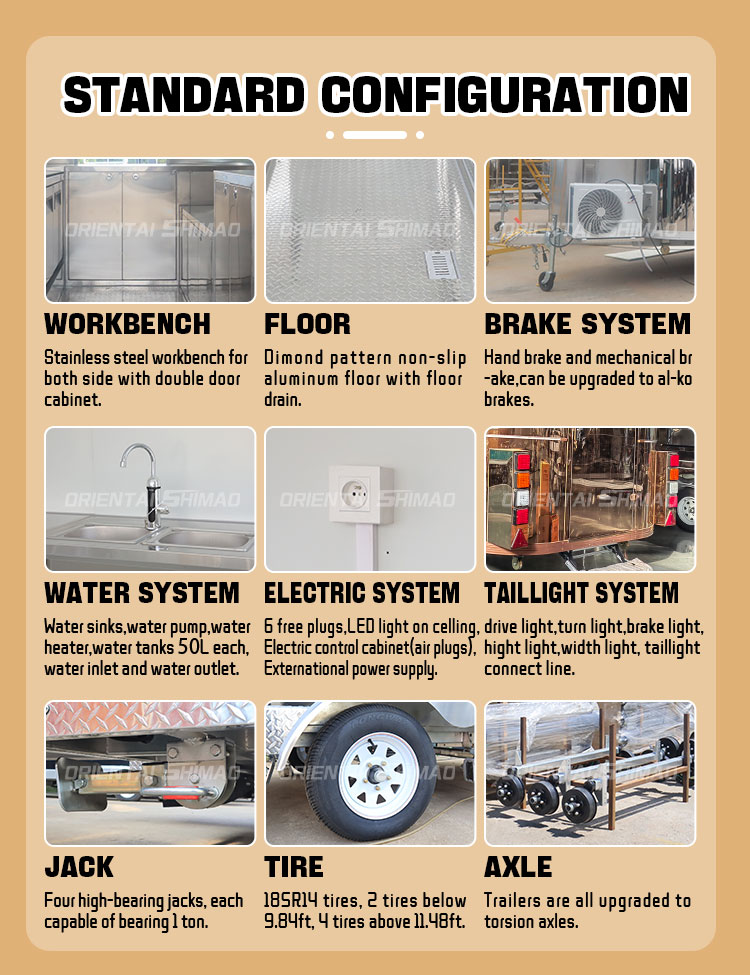 Para o material principal, escolhemos o aço inoxidável 304 de alta qualidade, que é conhecido por sua excelente resistência à corrosão e excelente durabilidade, podendo manter um desempenho estável em diversas condições ambientais, garantindo que nossos produtos de Trailer de Concessão para Festivais de Música possam manter sua excelente qualidade e funcionalidade mesmo no longo prazo e enfrentar uma variedade de desafios. Excelente resistência do aço inoxidável 304 à corrosão, fazendo com que o Trailer de Concessão para Festivais de Música não seja facilmente afetado por oxidação ou ferrugem, o que prolonga muito sua vida útil. A excelente resistência à corrosão do aço inox 304 torna o Trailer Concedido para Festivais de Música menos suscetível à oxidação ou ferrugem, prolongando muito sua vida útil.
