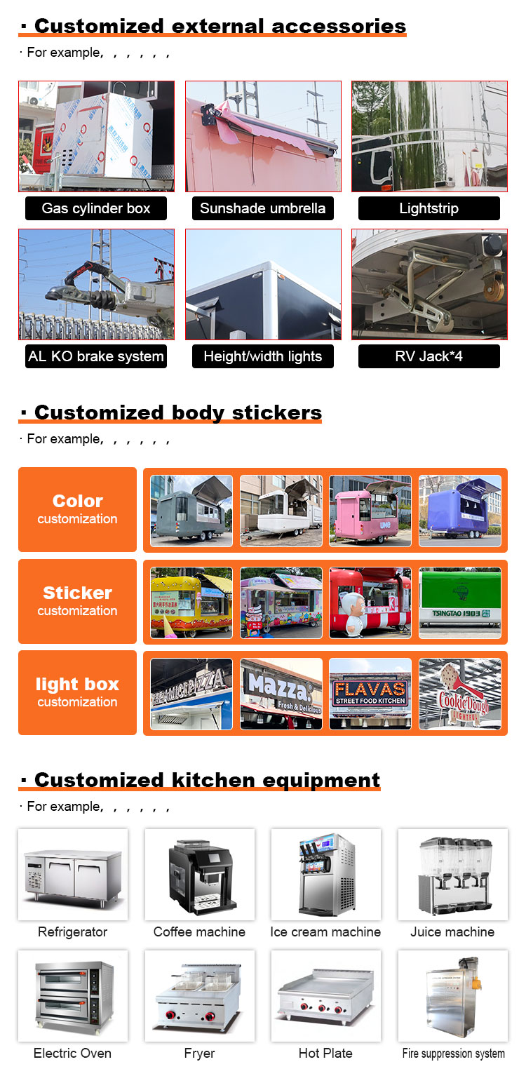 Carrinho de comida móvel, cozinha comercial, equipamento de restaurante, trailer de comida elétrico para uso na rua, caminhão de comida