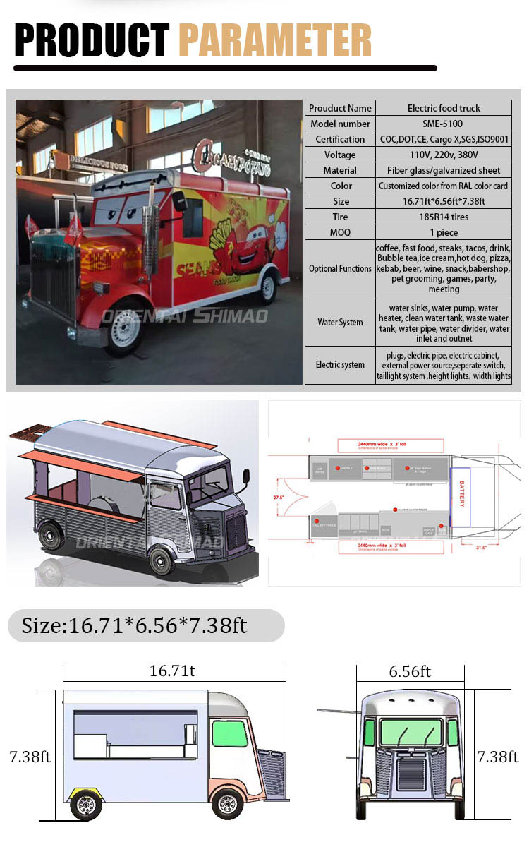 As especificações dos parâmetros de caminhão de alimentos elétricos de vendas a quente de 4,8m são as seguintes.