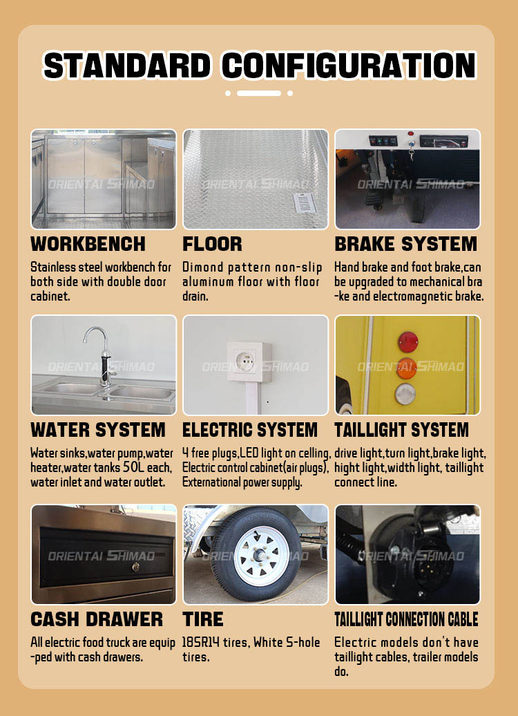 O reboque de alimentos elétricos de venda a quente pode usar para diferentes negócios, como café, fast food, hambúrguer, pizza e assim por diante.