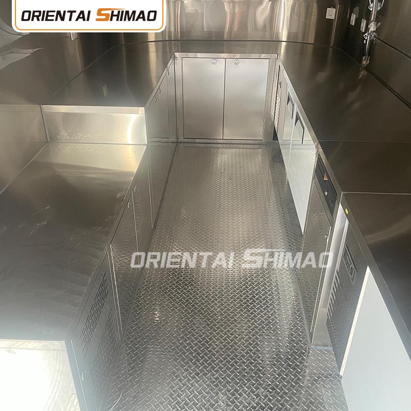 Piso de três camadas: O piso do food truck é projetado com três camadas. A camada superior é um piso de alumínio com superfície antiderrapante para garantir a segurança dos operadores; a camada intermediária é uma placa de madeira à prova de insetos importada pela Austrália; e a camada inferior é um plástico reforçado com fibra de vidro, que é à prova de umidade e insetos e prolonga a vida útil do piso.
