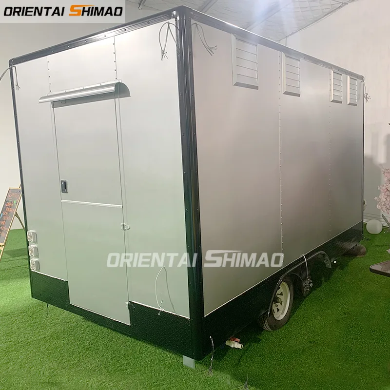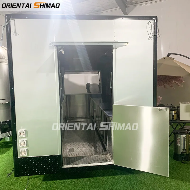 Reboque de fast food quadrado de alumínio: Máquina de sorvete, geladeira de pé, fatiador de carne, churrasqueira, AC, refrigerador de cobertura, fogão de 2 bocas etc.