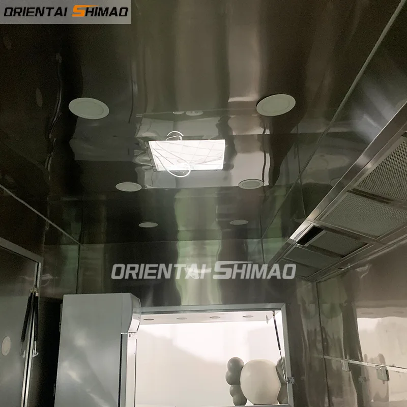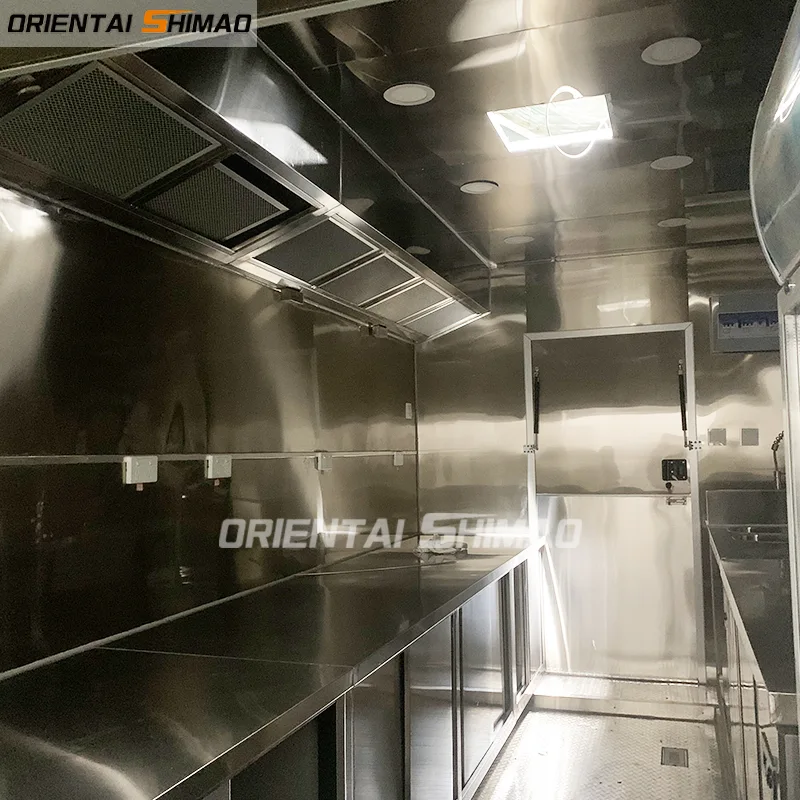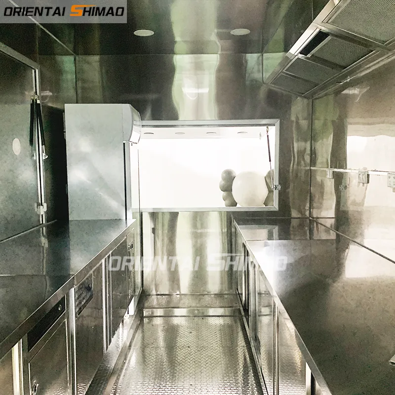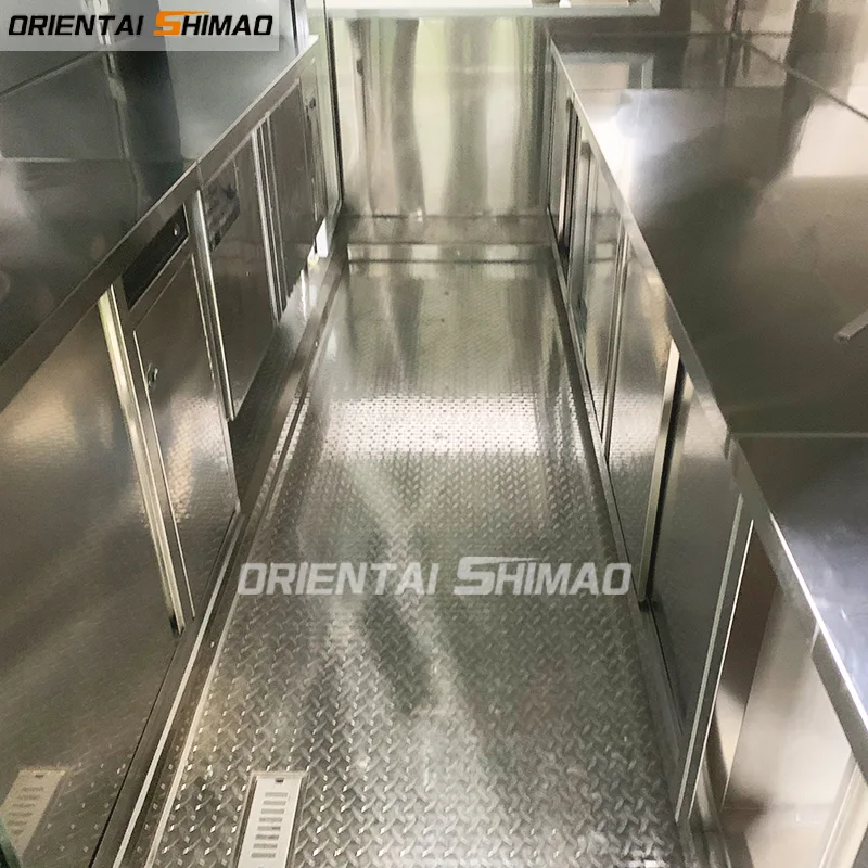 Reboque de fast food quadrado de alumínio. Utilizamos material de alta qualidade: Alumínio para construir o food truck. Para o interior, todos usamos aço inoxidável, o cliente pode usar por muito tempo. O trailer ficará mais leve e fácil de mover.
