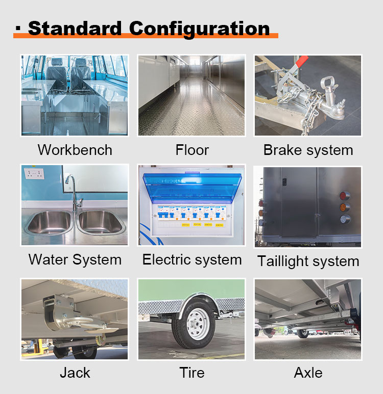 Quanto ao material dos acessórios, também insistimos na seleção de alta qualidade, incluindo puxadores, dobradiças e rodas em aço inoxidável e outros componentes essenciais, todos feitos de materiais de alta qualidade. Este design não só garante a consistência e estética geral da Food Van, mas também aumenta ainda mais a sua durabilidade e fiabilidade. O excelente desempenho dos acessórios permite que o Food Van seja mais estável e suave no processo de uso, além de reduzir os custos de manutenção e reposição causados por danos aos acessórios, proporcionando aos usuários uma experiência de uso mais descomplicada e econômica.