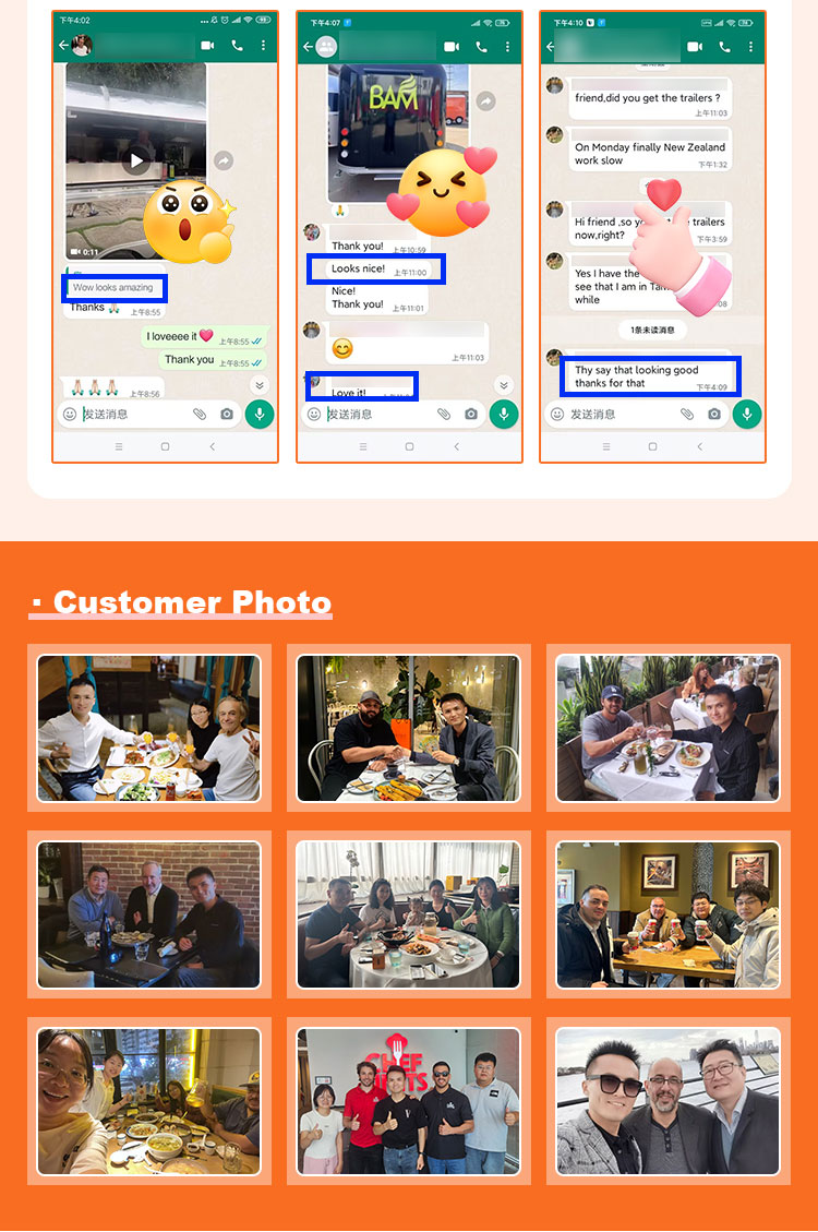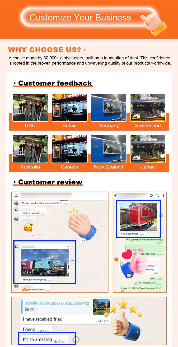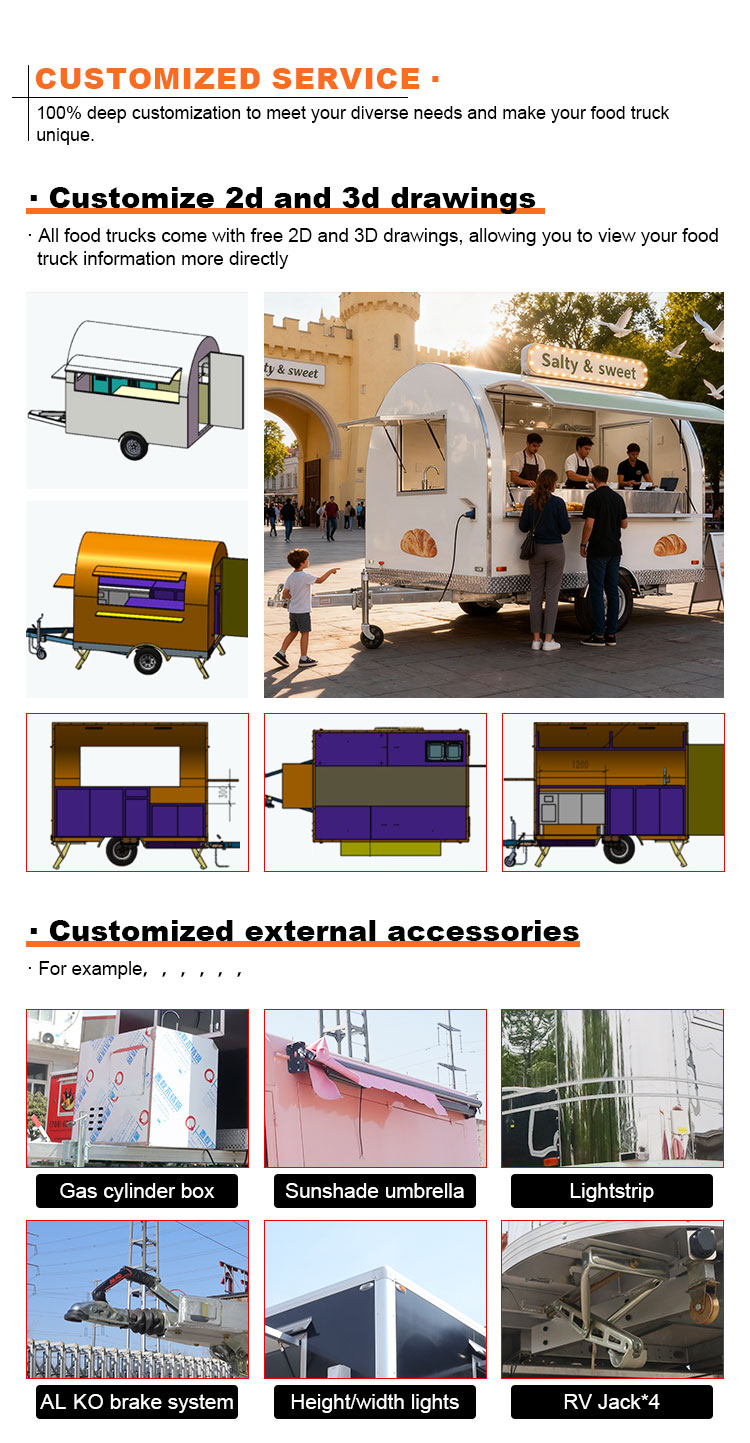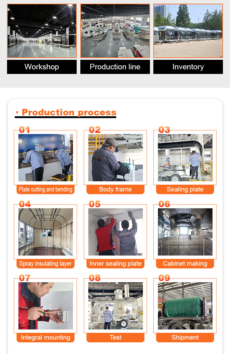 Para o material principal, escolhemos o aço inoxidável 304 de alta qualidade, que é conhecido por sua excelente resistência à corrosão e excelente durabilidade, e pode manter um desempenho estável em uma variedade de condições ambientais, garantindo que nossos produtos Food Van possam manter sua excelente qualidade e funcionalidade mesmo no longo prazo e enfrentar uma variedade de desafios. Excelente resistência do aço inoxidável 304 à corrosão, fazendo com que o Food Van não seja facilmente afetado pela oxidação ou ferrugem, o que prolonga muito sua vida útil. A excelente resistência à corrosão do aço inoxidável 304 torna as Food Vans menos suscetíveis à oxidação ou ferrugem, prolongando significativamente sua vida útil.