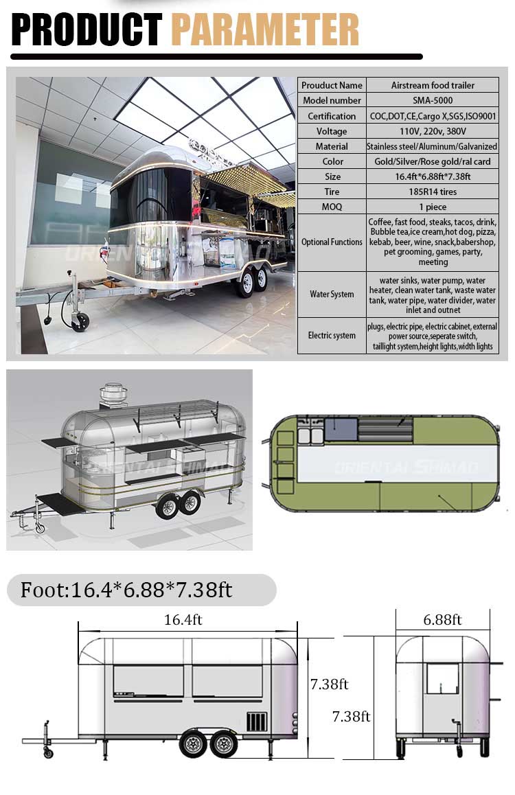 Aço inoxidável dourado: o exterior do food truck é feito de aço inoxidável dourado de alta qualidade. Este material não só possui excelente resistência à corrosão e abrasão, mas também o aspecto dourado aumenta a beleza visual e a sensação de alta qualidade, para que o food truck possa se destacar em diversos ambientes.