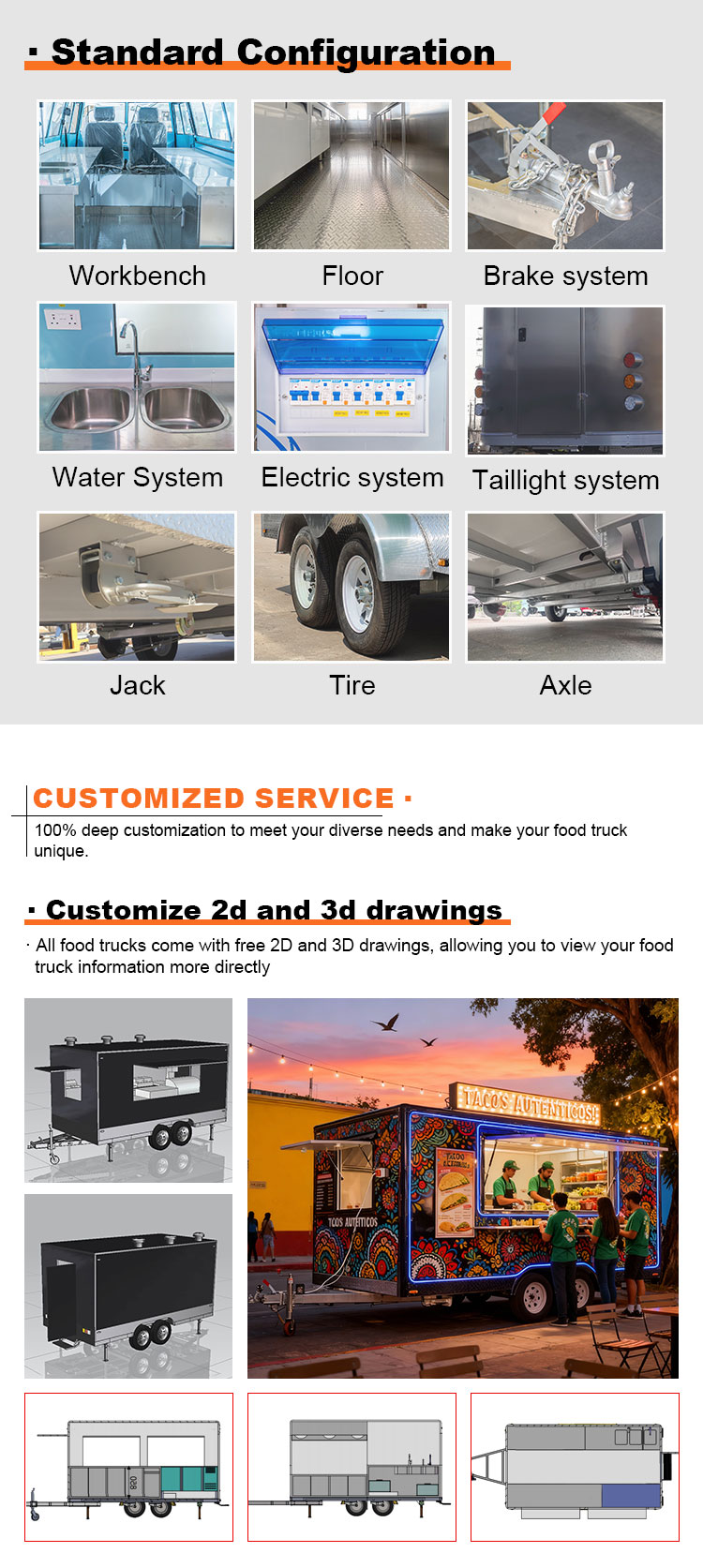 Para o material principal, escolhemos o aço inoxidável 304 de alta qualidade, que é conhecido por sua excelente resistência à corrosão e excelente durabilidade, e pode manter um desempenho estável em uma variedade de condições ambientais, garantindo que nossos produtos de reboques para catering possam manter sua excelente qualidade e funcionalidade mesmo no longo prazo e enfrentar uma variedade de desafios. Excelente resistência do aço inoxidável 304 à corrosão, fazendo com que o Caminhão não seja facilmente afetado pela oxidação ou ferrugem, o que prolonga muito sua vida útil. A excelente resistência à corrosão do aço inoxidável 304 torna o caminhão menos suscetível à oxidação ou ferrugem, prolongando bastante sua vida útil.
