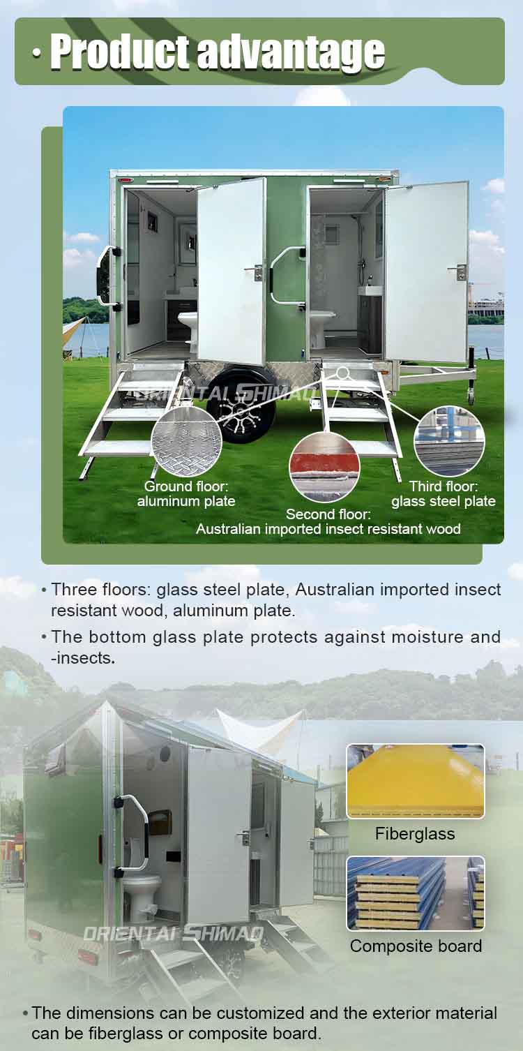 O Oriental Shimao Deluxe ecológico ao ar livre trailer é uma solução de banheiro portátil projetada para atender às necessidades de ponta para todos os tipos de eventos em larga escala, canteiros de obras, acampamentos ao ar livre e sites de resgate de emergência. Combinando a tecnologia ambiental avançada com o design fácil de usar, este veículo de saneamento oferece uma experiência de banheiro confortável, segura e eficiente, tornando-a a melhor opção para instalações de saneamento temporárias modernas.