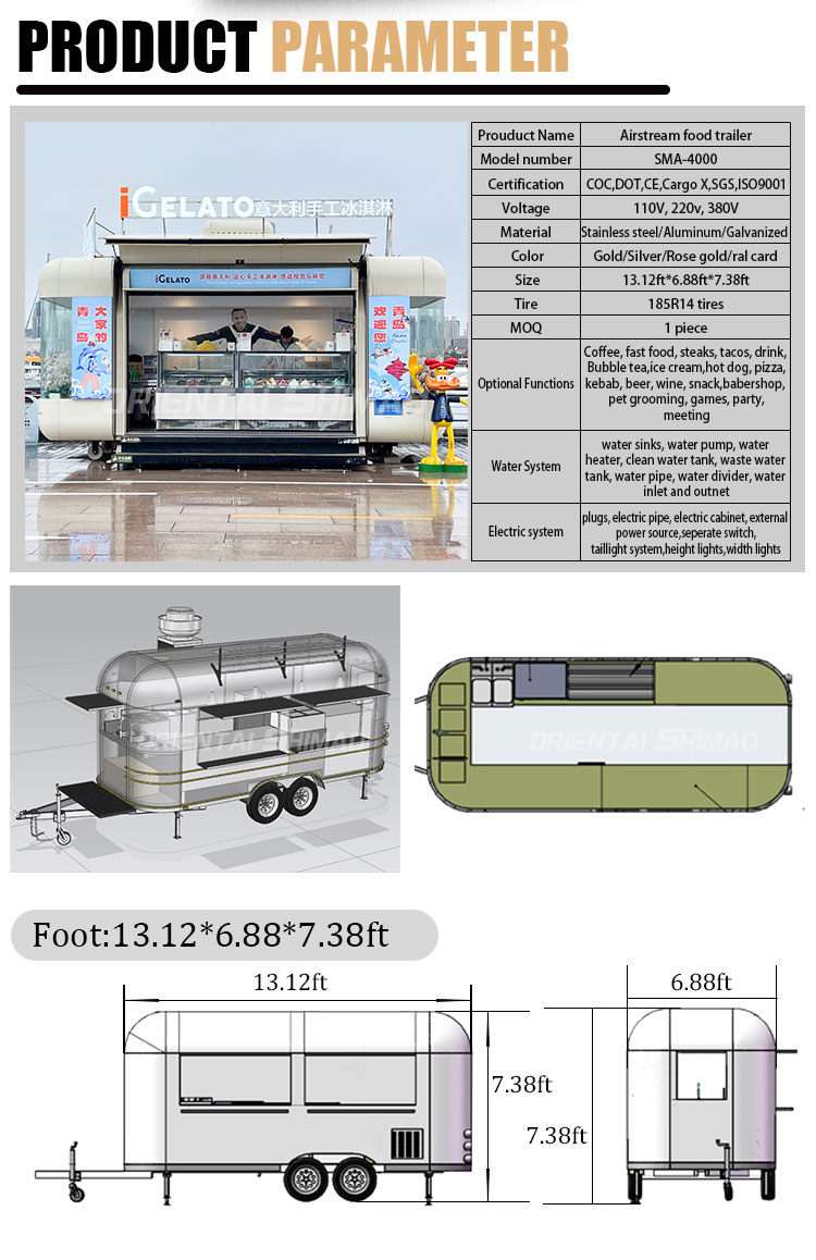 Aço inoxidável dourado: o exterior do food truck é feito de aço inoxidável dourado de alta qualidade. Este material não só possui excelente resistência à corrosão e abrasão, mas também o aspecto dourado aumenta a beleza visual e a sensação de alta qualidade, para que o food truck possa se destacar em diversos ambientes.