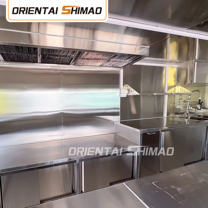 Aço inoxidável: O aço inoxidável também é uma das escolhas comuns para painéis externos, especialmente o aço inoxidável 304 de qualidade alimentar. O aço inoxidável é resistente à corrosão, ao calor e fácil de limpar, tornando-o adequado para uso em cozinhas, balcões e outras áreas de food trucks que entram em contato com alimentos. Ao mesmo tempo, a beleza do aço inoxidável também pode realçar a textura geral do food truck.