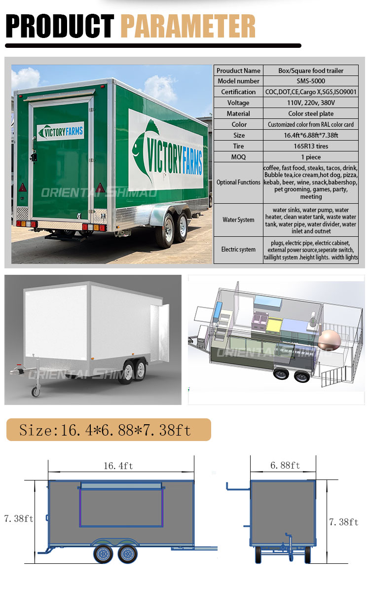 Personalização de tamanho: Além dos limites tradicionais, quebramos a estrutura de tamanho dos food trucks convencionais e oferecemos possibilidades ilimitadas de soluções de personalização de tamanho. Quer você esteja procurando um mini food truck pequeno e requintado, fácil de percorrer pelos becos da cidade, ou um luxuoso restaurante móvel que deseja ter um espaço amplo para acomodar mais clientes e equipamentos, podemos medir com precisão e projetar cuidadosamente de acordo com suas necessidades específicas para criar um tamanho de food truck que atenda às necessidades reais e seja cheio de criatividade.