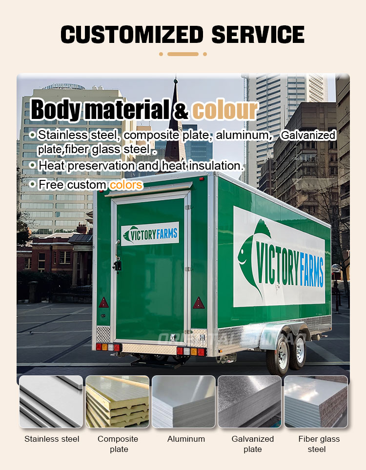 Personalização de materiais: A escolha do material está diretamente relacionada à durabilidade, estética e segurança do food truck. Oferecemos uma ampla gama de materiais de carroceria, desde liga de alumínio durável até fibra de carbono leve, desde aço inoxidável clássico até materiais compostos que economizam energia, cada um com suas próprias vantagens e cenários de aplicação exclusivos. Entretanto, também prestamos atenção aos detalhes, seja o material das rodas, a robustez do quadro de tração ou a comodidade do macaco, iremos personalizá-lo de acordo com as suas reais necessidades para garantir que cada parte do food truck possa atingir o desempenho ideal.