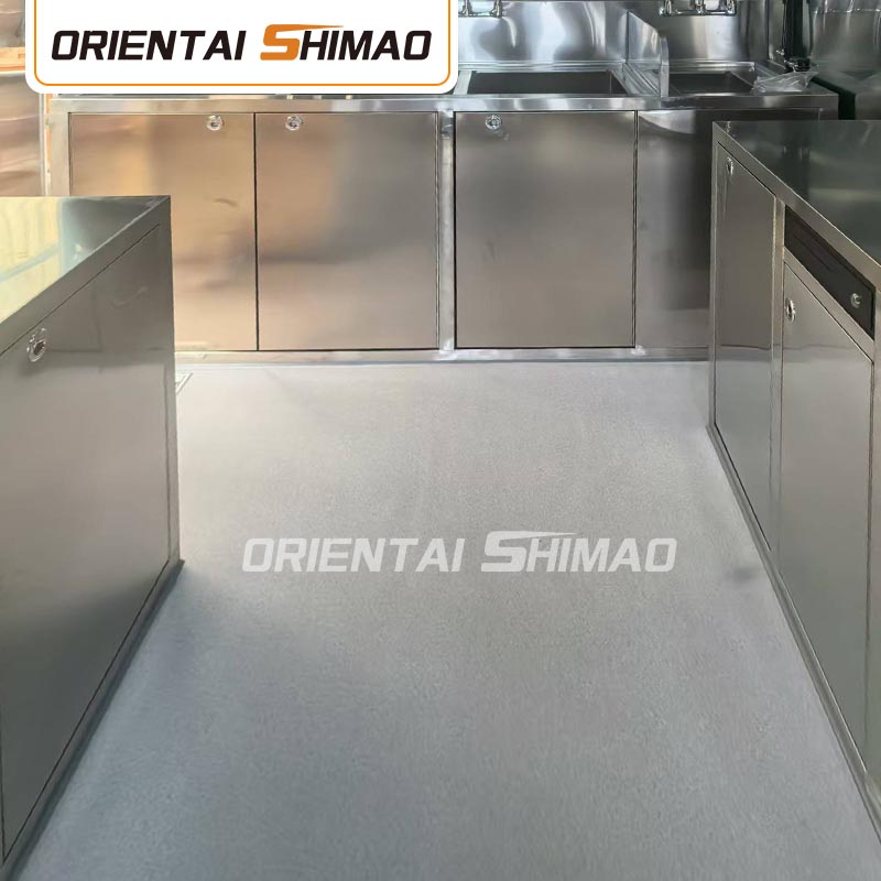 Piso de três camadas: O piso do food truck é projetado com três camadas. A camada superior é um piso de alumínio com superfície antiderrapante para garantir a segurança dos operadores; a camada intermediária é uma placa de madeira à prova de insetos importada pela Austrália; e a camada inferior é um plástico reforçado com fibra de vidro, que é à prova de umidade e insetos e prolonga a vida útil do piso.