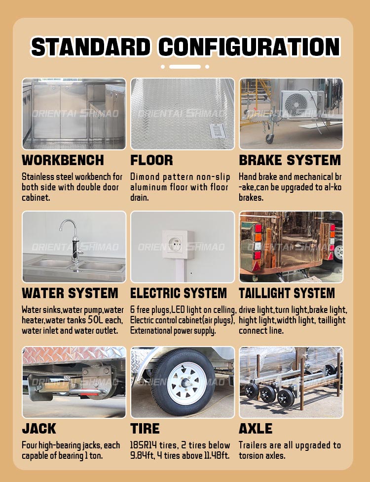 Para o material principal, escolhemos o aço inoxidável 304 de alta qualidade, que é conhecido por sua excelente resistência à corrosão e excelente durabilidade, podendo manter um desempenho estável em uma variedade de condições ambientais, garantindo que nossos produtos Taco Concession Food Truck possam manter sua excelente qualidade e funcionalidade mesmo no longo prazo e enfrentar uma variedade de desafios. Excelente resistência do aço inoxidável 304 à corrosão, fazendo com que o Caminhão não seja facilmente afetado pela oxidação ou ferrugem, o que prolonga muito sua vida útil. A excelente resistência à corrosão do aço inoxidável 304 torna o caminhão menos suscetível à oxidação ou ferrugem, prolongando bastante sua vida útil.